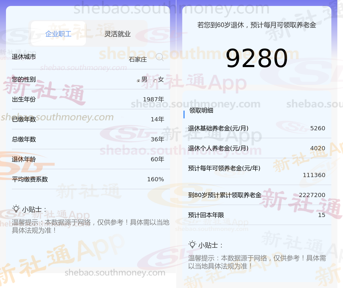 通过新社通APP-养老金计算所得:退休城市、出生年份、退休年龄、缴费系数都相同的情况下,社保缴费年限累计36年时,计算如下: