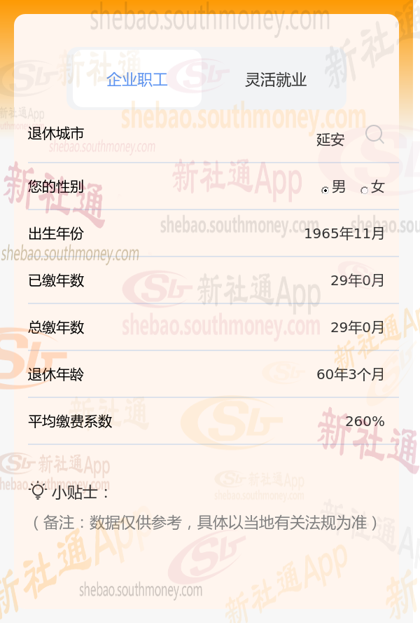 退休城市:延安,性别:男,出生年份:1965,总缴年数29年,缴费档次:260%为例,新社通app养老金计算器预设工资增长率等参数为3%。在此情境下,其退休后能领取的养老金数额需通过计算器精确得出,但基于上述条件,预计数额会相对较低。为获准确估算,建议张某使用计算工具按要求输入个人信息进行计算,具体数额依个人情况及当地法规而定。