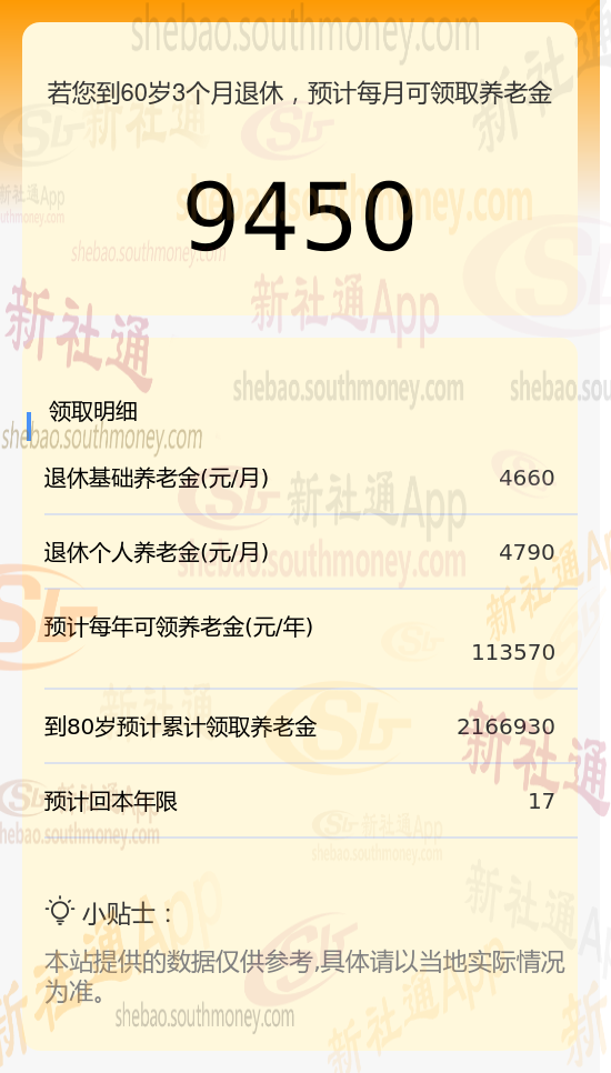 新社通app养老金计算器计算所得: