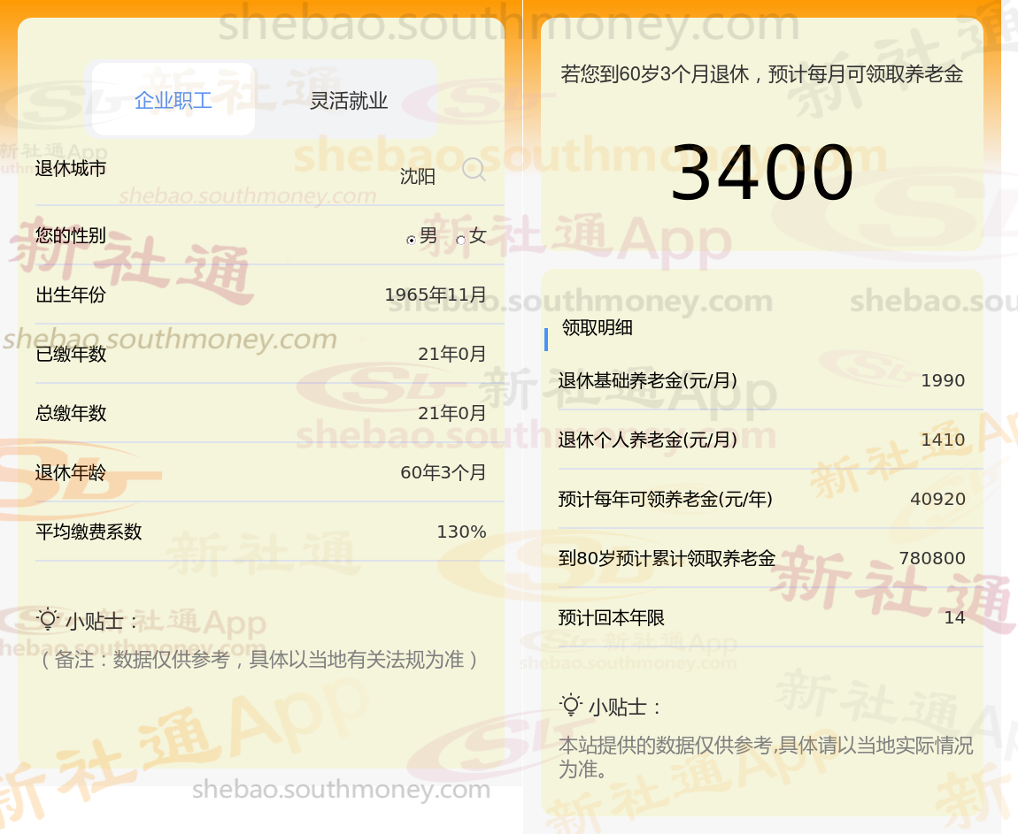 社保按130%档次缴费的刘某,沈阳城市退休,出生于1965年,工龄21年,男性。岁月流转,他终于迎来了自己的退休年龄。根据新社通app养老金在线计算器计算所得: