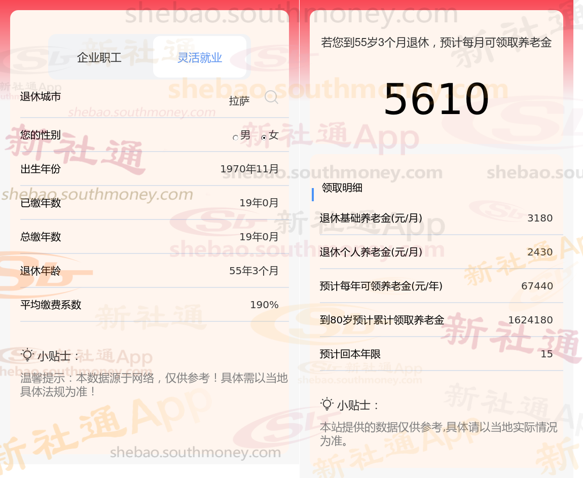 朋友吕某退休城市在拉萨,性别:女,出生年份:1970,总缴年数19年,缴费档次:190%,新社通app养老金计算器所得: