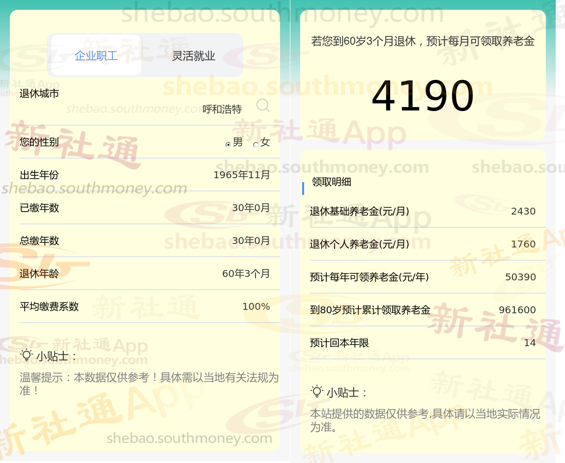 退休城市:内蒙古呼和浩特,性别:男,出生年份:1965,总缴年数30年,缴费档次:100%,新社通app养老金计算器所得: