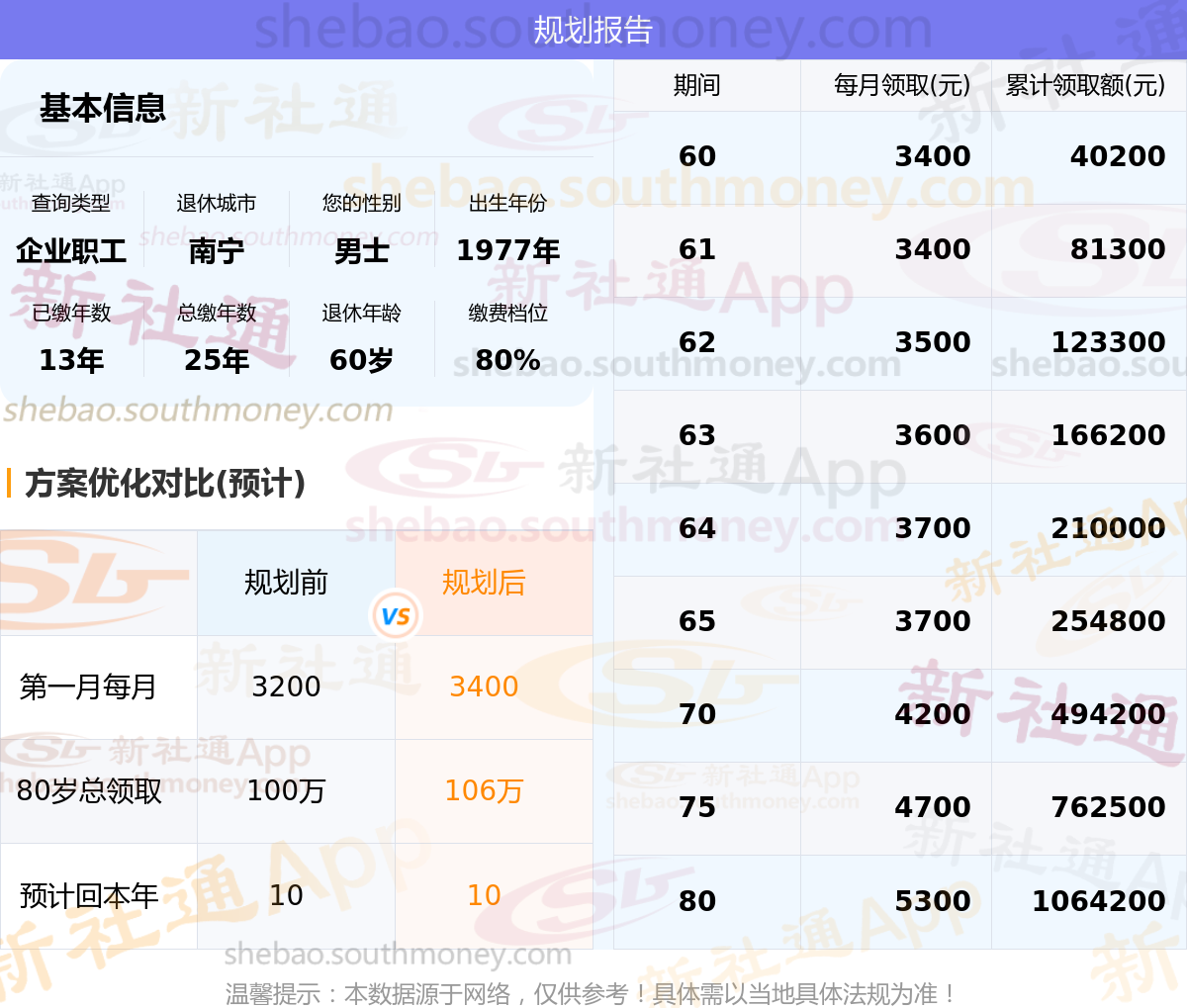 规划前:参保城市:广西南宁,性别:男士,出生年月:1977,已缴年限:13年,总缴年数:25年,退休年龄:60岁,缴费档位:80%。