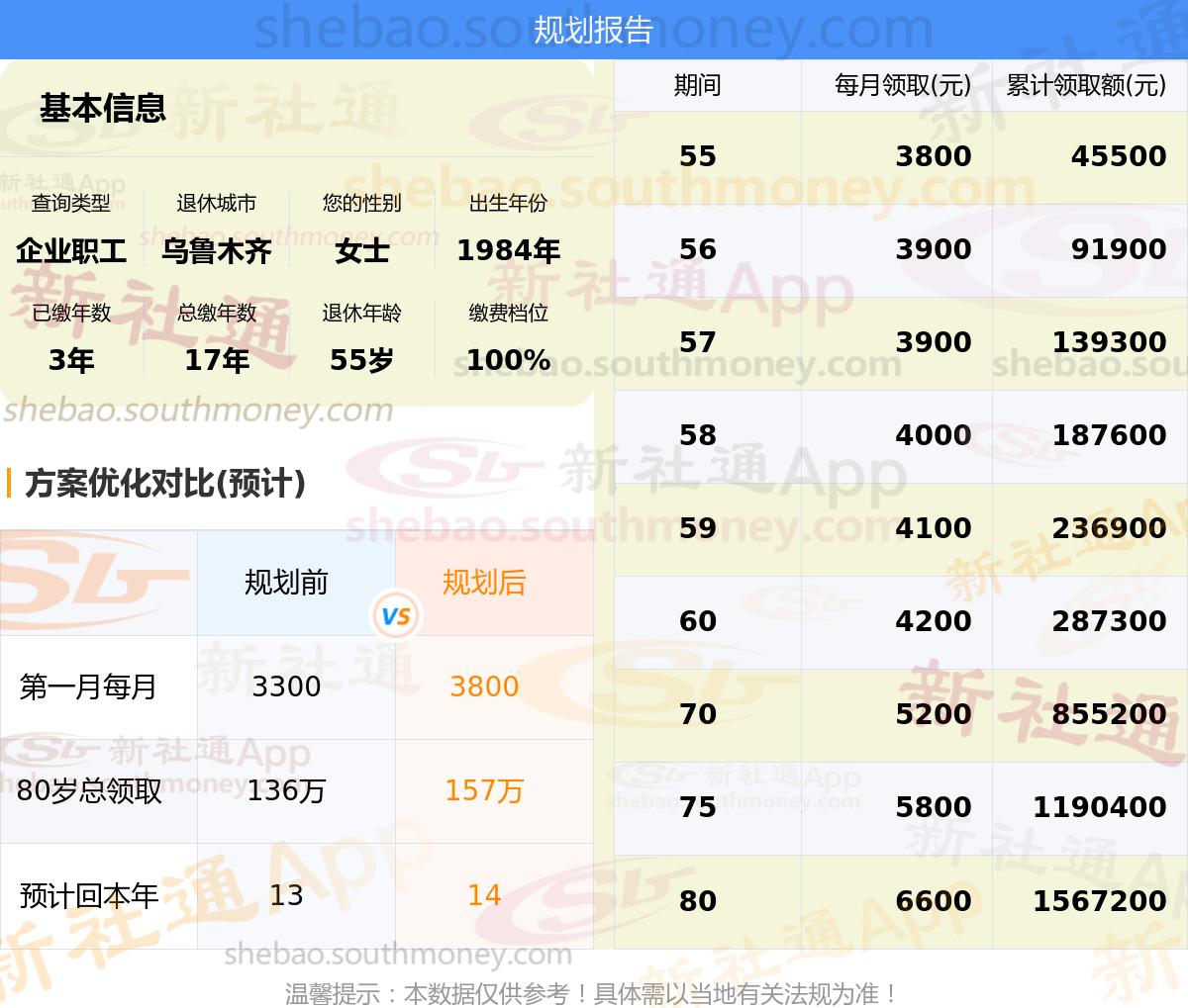 规划前:参保城市:乌鲁木齐,性别:女士,出生年月:1984,已缴年限:3年,总缴年数:17年,退休年龄:55岁,缴费档位:100%。