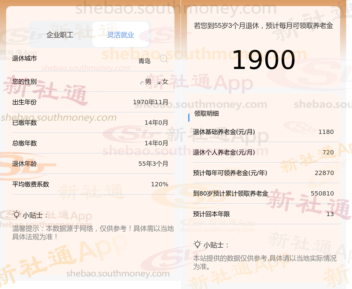 退休城市:青岛,性别:女,出生年份:1970,总缴年数14年,缴费档次:120%,新社通app养老金计算器所得: