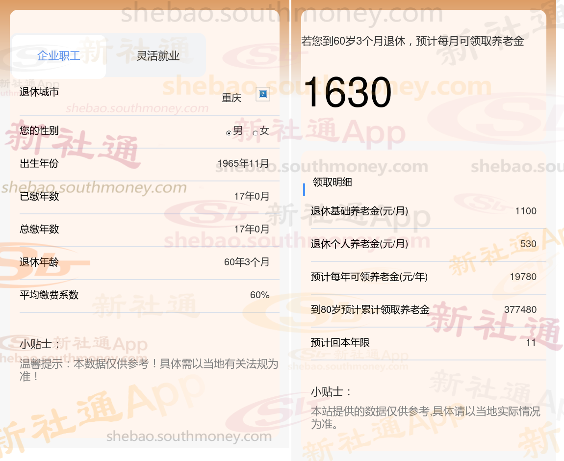 个人档案:男性,1965年出生,重庆退休职工,社保缴费17载,档次60%。