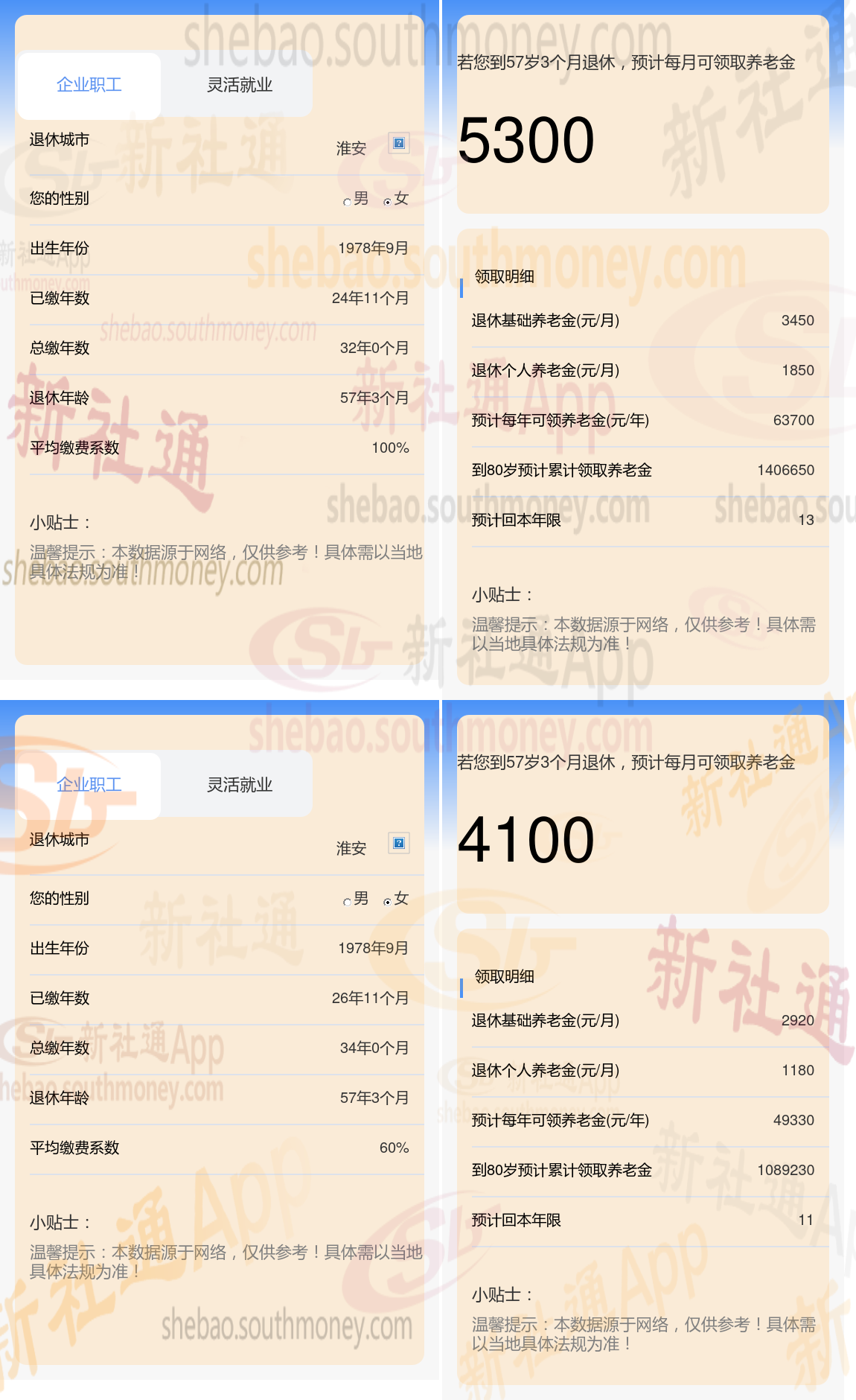 以淮安这座城市作为背景,新社通APP来对比两位退休人员的养老金情况: 第一位是秦某,他在淮安退休,社保缴费的年限达到了32年,于57周岁时退休,且他一直是按照100%的缴费档位进行缴纳的。 另一位是老冯,同样在淮安退休,但他的缴费年限稍长,为34年,也是在57周岁时退休。不过,与秦某,不同的是吕某是按照60%的比例来缴纳社保的。 (注:此讨论中,新社通APP暂不考虑过渡养老金。)