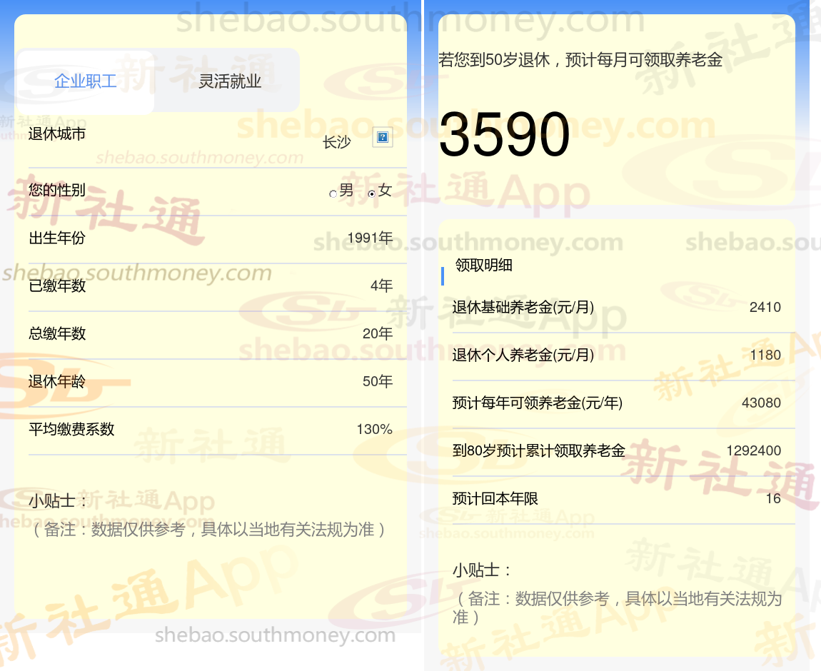 通过新社通APP-养老金计算所得:退休城市、出生年份、退休年龄、缴费系数都相同的情况下,社保缴费年限累计20年时,计算如下: