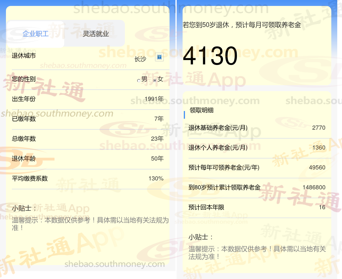 通过新社通APP-养老金计算所得:退休城市、出生年份、退休年龄、缴费系数都相同的情况下,社保缴费年限累计23年时,计算如下:
