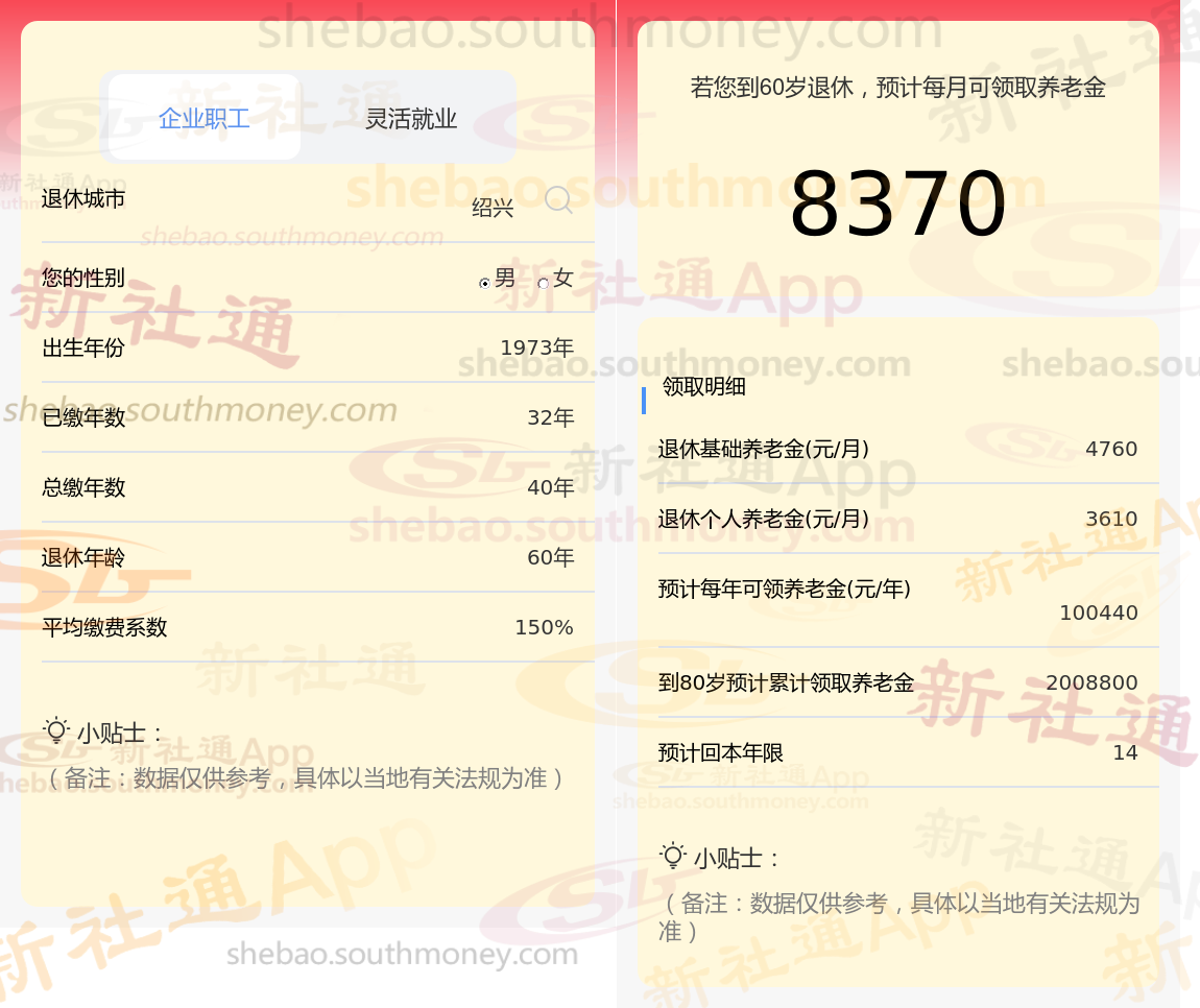 通过新社通APP-养老金计算所得:退休城市、出生年份、退休年龄、缴费系数都相同的情况下,社保缴费年限累计40年时,计算如下: