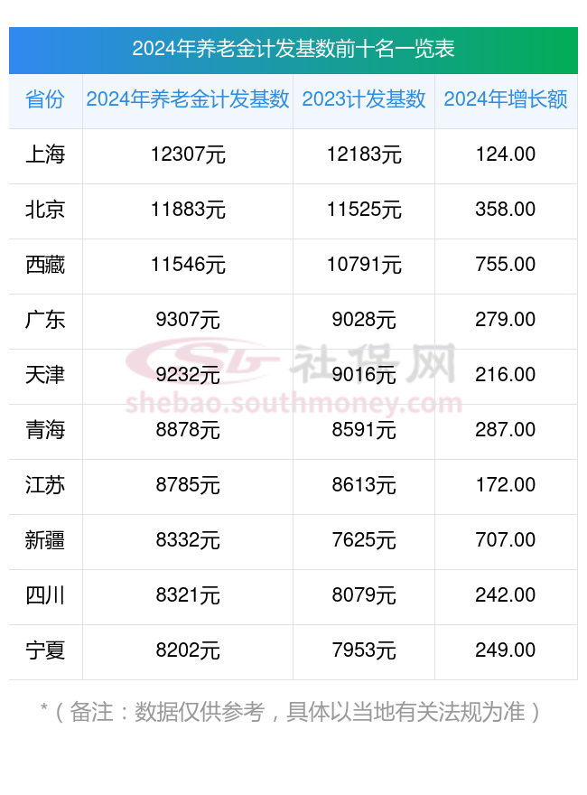 据新社通app显示,2024年上海位列第一位,养老金计发基数达到12307.00元;北京排名第二,养老金计发基数为11883.00元;西藏排名第三,养老金计发基数11546.00元。排名前10的还有:广东、天津、青海、江苏、湖北、新疆、四川。