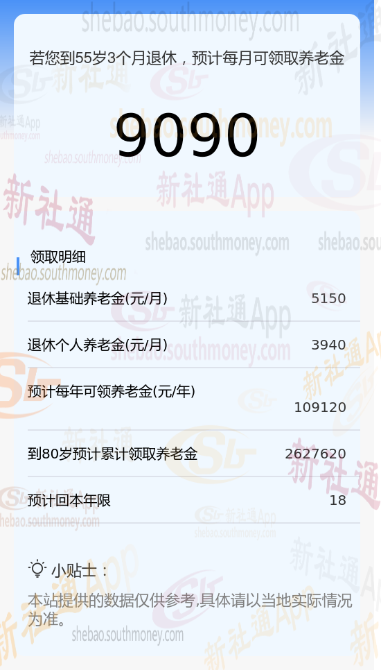 基础退休金:基础养老金=(参保退休时本省上一年度在岗职工月平均工资+本人指数化月平均工缴费工资)÷2×缴费年限×1%。通过公式计算出每月大约5150元。