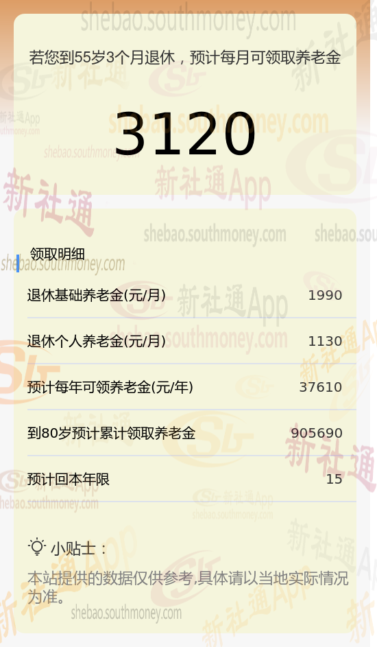 社保按130%档次缴费的王某,锦州城市退休,出生于1970年,工龄21年,女性。岁月流转,她终于迎来了自己的退休年龄。根据新社通app养老金在线计算器计算所得: