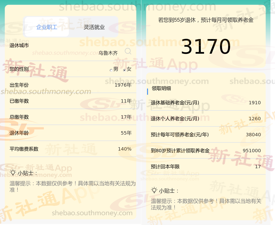 通过新社通APP-养老金计算所得:退休城市、出生年份、退休年龄、缴费系数都相同的情况下,社保缴费年限累计17年时,计算如下: