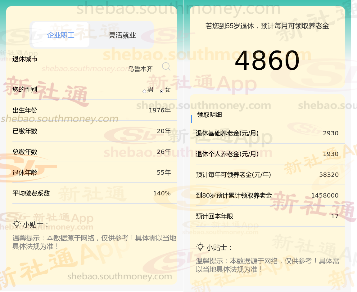 通过新社通APP-养老金计算所得:退休城市、出生年份、退休年龄、缴费系数都相同的情况下,社保缴费年限累计26年时,计算如下: