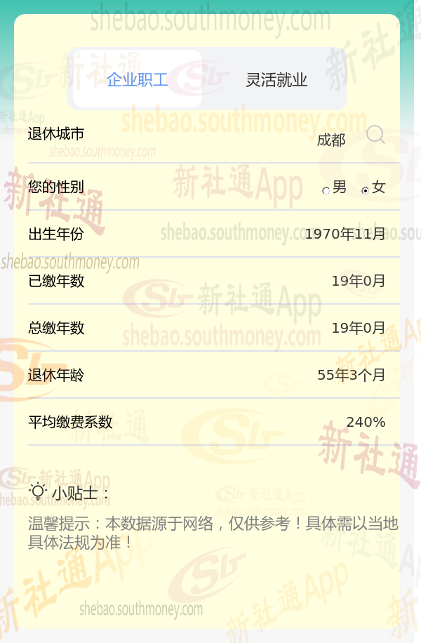 笔友孔某退休城市在成都,性别:女,出生年份:1970为例,假设其按最低标准(缴费系数0.6)缴纳社保,新社通app养老金计算器预设工资增长率等参数为3%。在此情境下,其退休后能领取的养老金数额需通过计算器精确得出,但基于上述条件,预计数额会相对较低。为获准确估算,建议孔某使用计算工具按要求输入个人信息进行计算,具体数额依个人情况及当地法规而定。