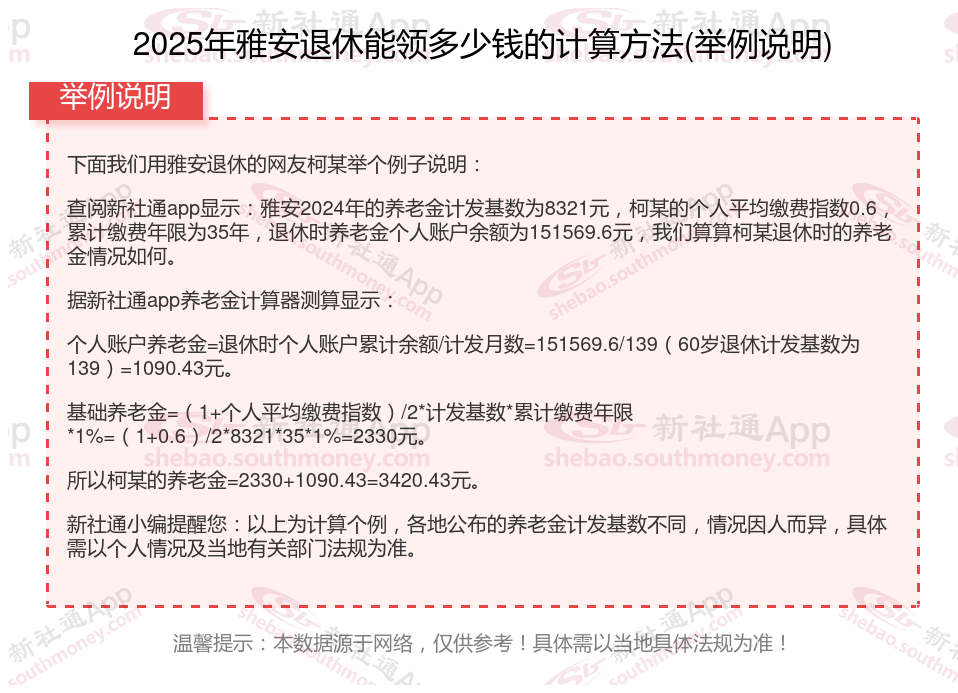 1、基础养老金计算公式=雅安养老金计发基数×(1+平均缴费指数)÷2×缴费年限×1%。