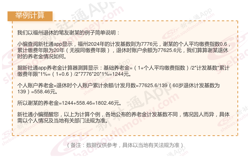 其中,计算公式不相同,我们用在福州退休网友举个例子说明一下,福州2024年的计发基数则为7776元,个人平均缴费指数0.6,该网友累计缴费年限为41年(含视同缴费年限7年),退休时账户余额为159132.48元,视同缴费指数为0.6,福州的过渡性指数为1.30%,我们算算这位网友退休时的养老金情况如何。