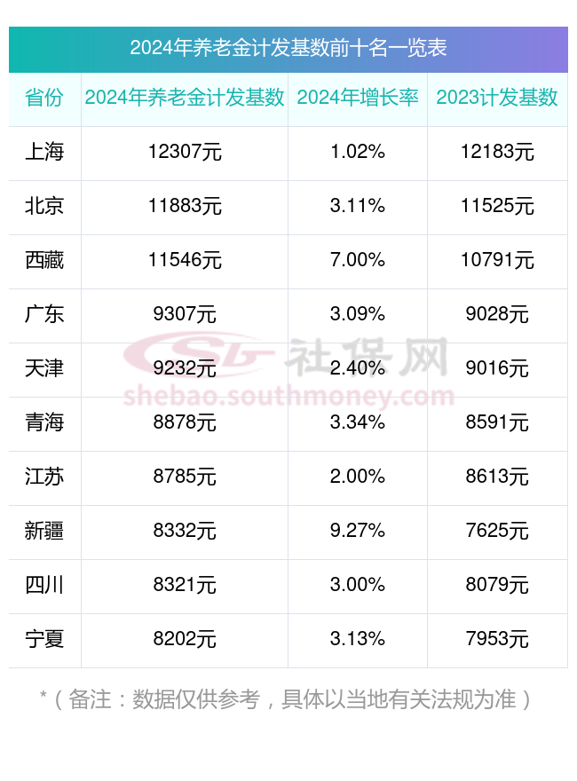 据新社通app显示,2024年上海位列第一位,养老金计发基数达到12307.00元,增长率为1.02%;北京排名第二,养老金计发基数为11883.00元,增长率为3.11%;西藏排名第三,养老金计发基数11546.00元,增长率为7.00%。排名前10的还有:广东、天津、青海、江苏、湖北、新疆、四川。