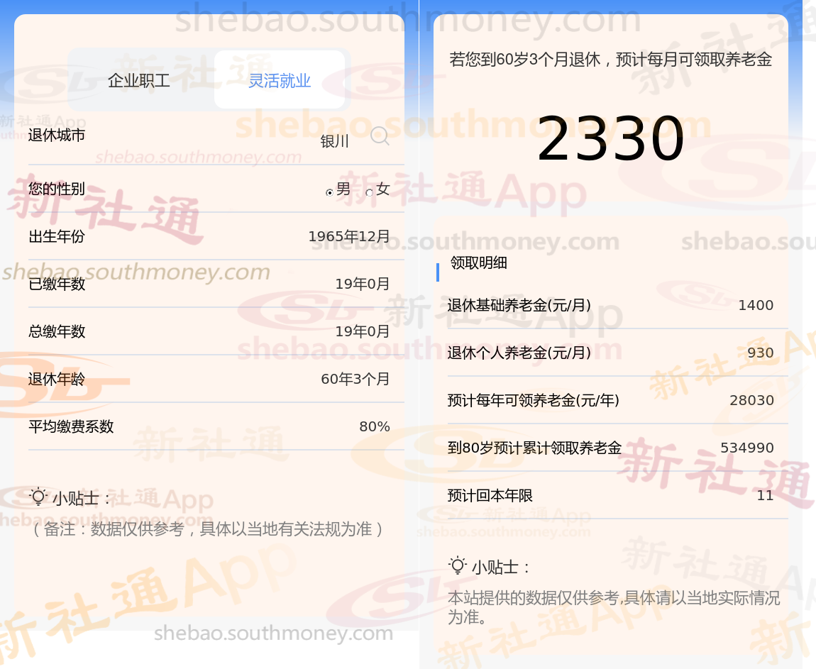退休城市:银川,性别:男,出生年份:1965,总缴年数19年,缴费档次:80%,新社通app养老金计算器所得: