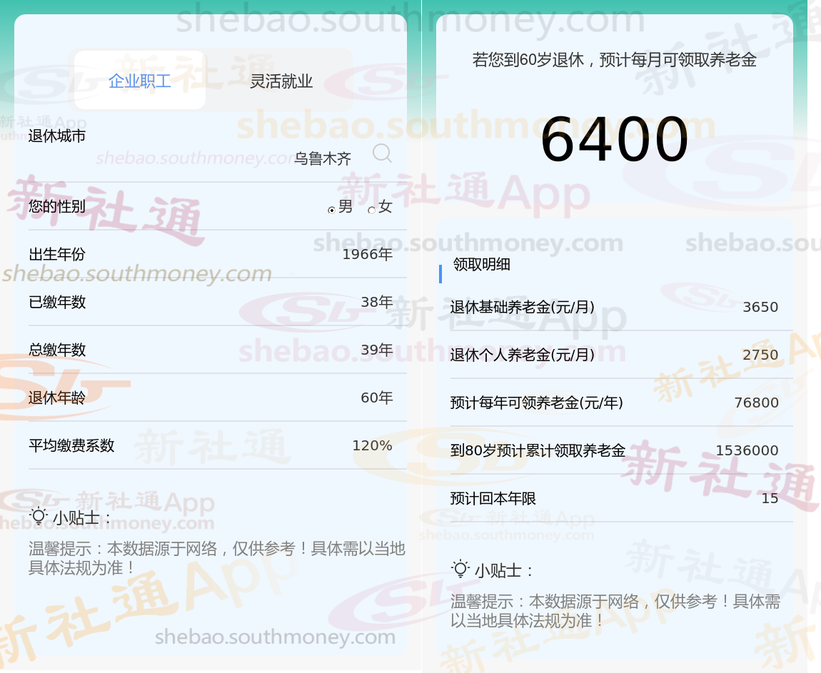 通过新社通APP-养老金计算所得:退休城市、出生年份、退休年龄、缴费系数都相同的情况下,社保缴费年限累计38年时,计算如下:
