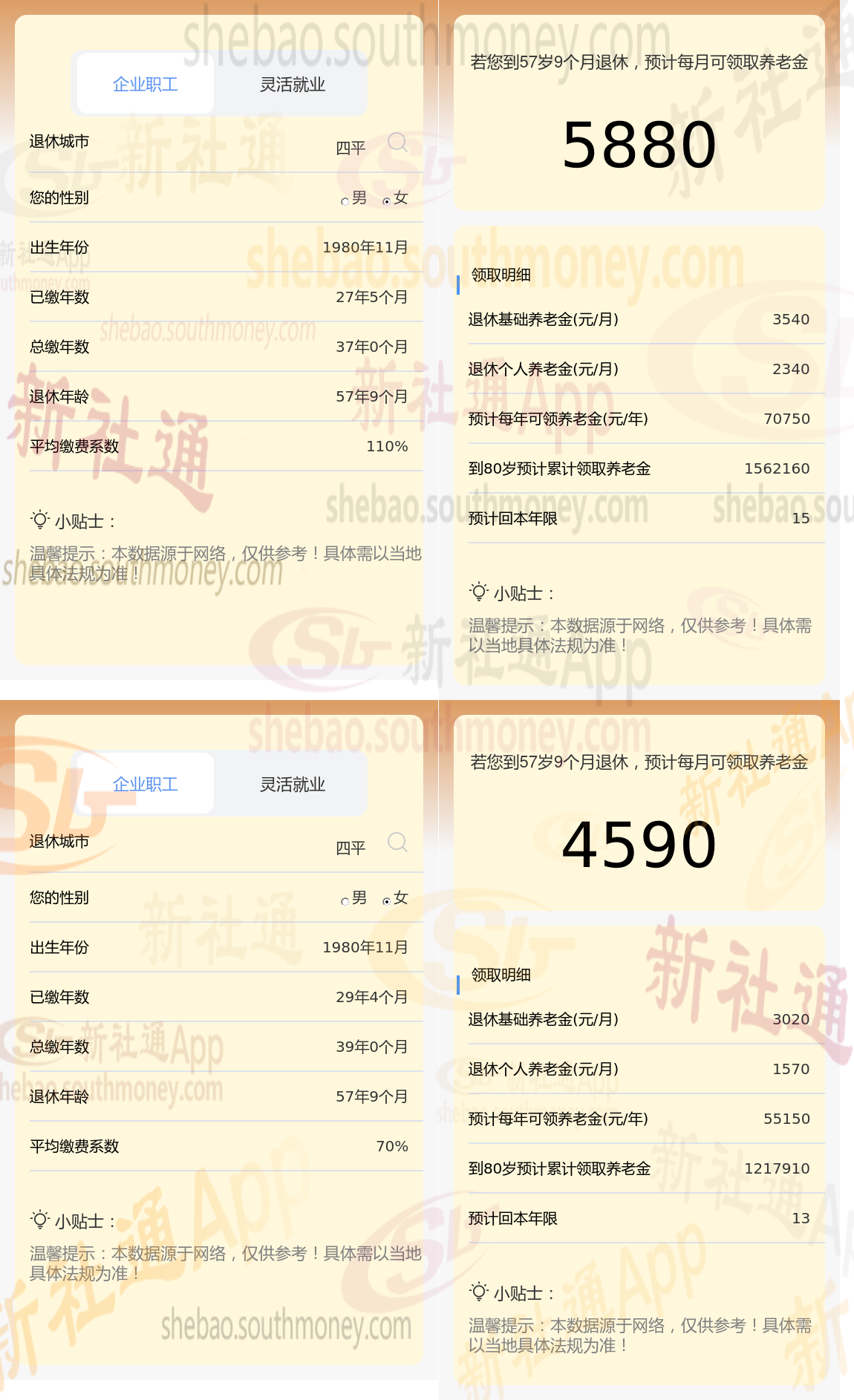 根据新社通app养老金计算器,轻松测算您的养老金!计算所得出:秦某与老杜的差别,缴费年限、缴费档位不同的情况下,差别5880-4590=1290元。