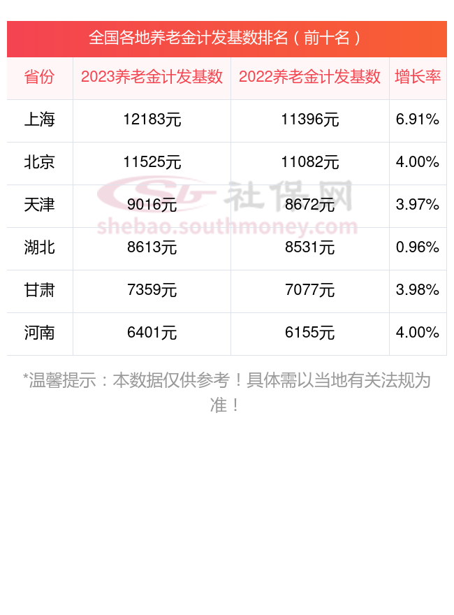 一、2023-2024年全国各地养老金计发基数排名前十