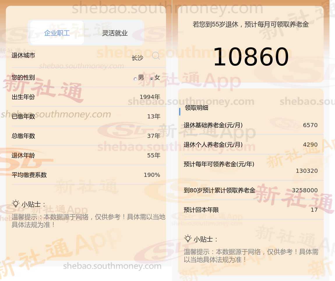通过新社通APP-养老金计算所得:退休城市、出生年份、退休年龄、缴费系数都相同的情况下,社保缴费年限累计37年时,计算如下: