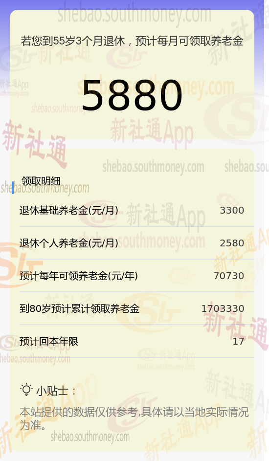 每月可领养老金=基础养老金+个人养老金≈3300+2580≈5880元。