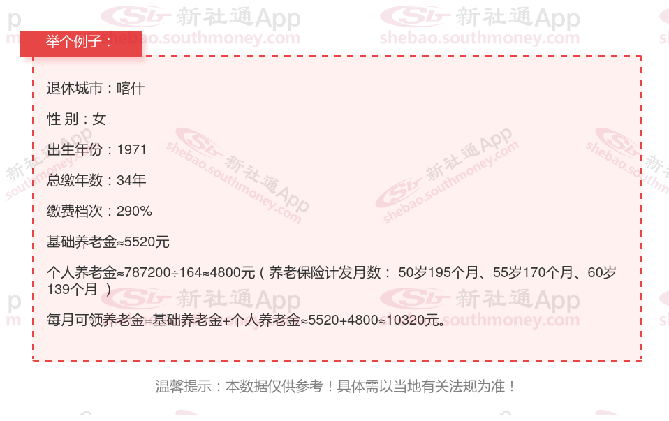 杨某,喀什人,1971年出生,是一名拥有34载社保缴费年限的退休女性,缴费档次稳定在290%。岁月流转,她终于迎来了自己的退休时光。借助新社通app养老金计算器计算所得,杨某惊喜地发现,她每月可以领取到基础养老金大约5520元,再加上个人养老金约4800元,两项合计,她每月的养老金总额达到了10320元。虽然数额不大,但足以让她的退休生活充满温馨与安宁。
