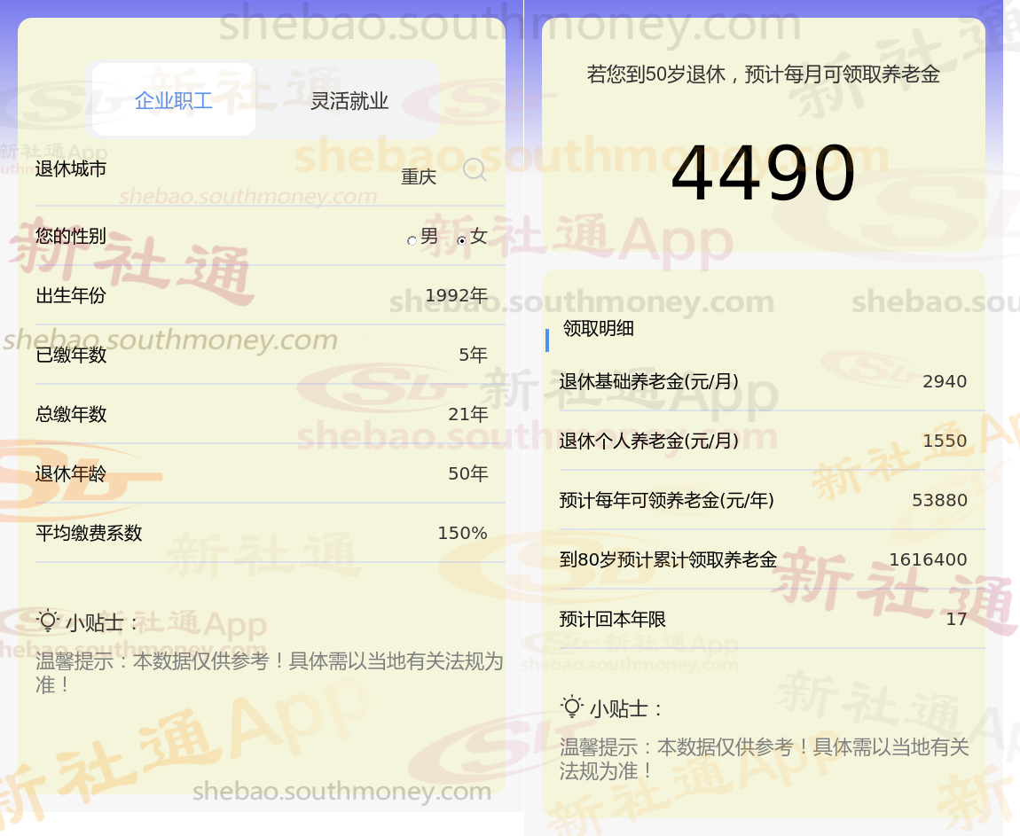通过新社通APP-养老金计算所得:退休城市、出生年份、退休年龄、缴费系数都相同的情况下,社保缴费年限累计21年时,计算如下: