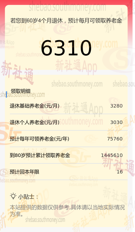 每月可领养老金=基础养老金+个人养老金≈3280+3030≈6310元。