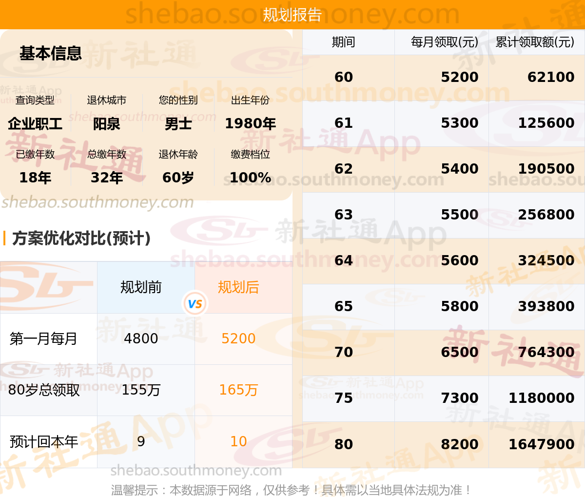 规划前:60岁第一个月约领4800元,新社通APP-养老金规划后:60岁第一个月约领5200元