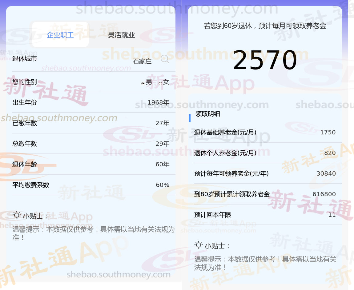通过新社通APP-养老金计算所得:退休城市、出生年份、退休年龄、缴费系数都相同的情况下,社保缴费年限累计29年时,计算如下: